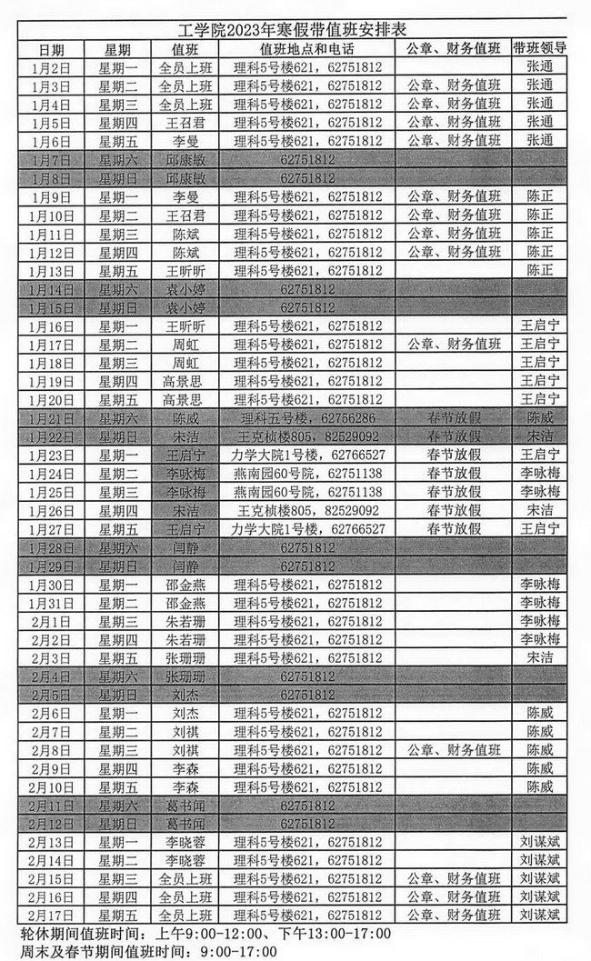william威廉中文官网2023年寒假带值班安排表