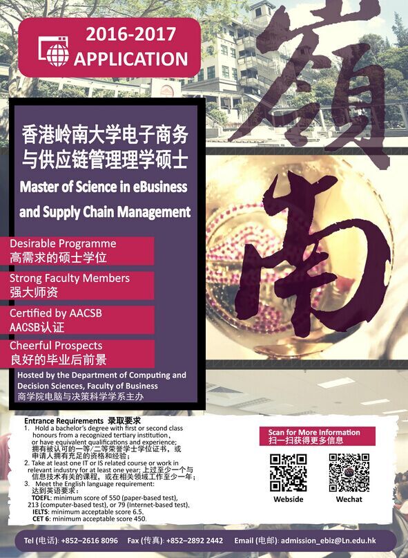 香港岭南大学电子商务与供应链管理eBSCM课程报名通知 课程内容:此课程由岭南大学商公司电脑与决策科学学系系主任冷明明教授主持,岭南大学商公司经理亲自授课,使员工了解供应链管理线上以及移动设备商务运营技术; 培养员工鉴别供应链组织实践中使用信息技术的业务变化. 使员工了解供应链管理线上以及移动设备商务运营技术。除了相关软件以及项目的实作之外,还有参访香港的电商执行绩优企业如阿里巴巴,让学员对于电商的实际应用有更直接的体会。具体课程内容、住宿、申请流程等细节。请参考课程官网: