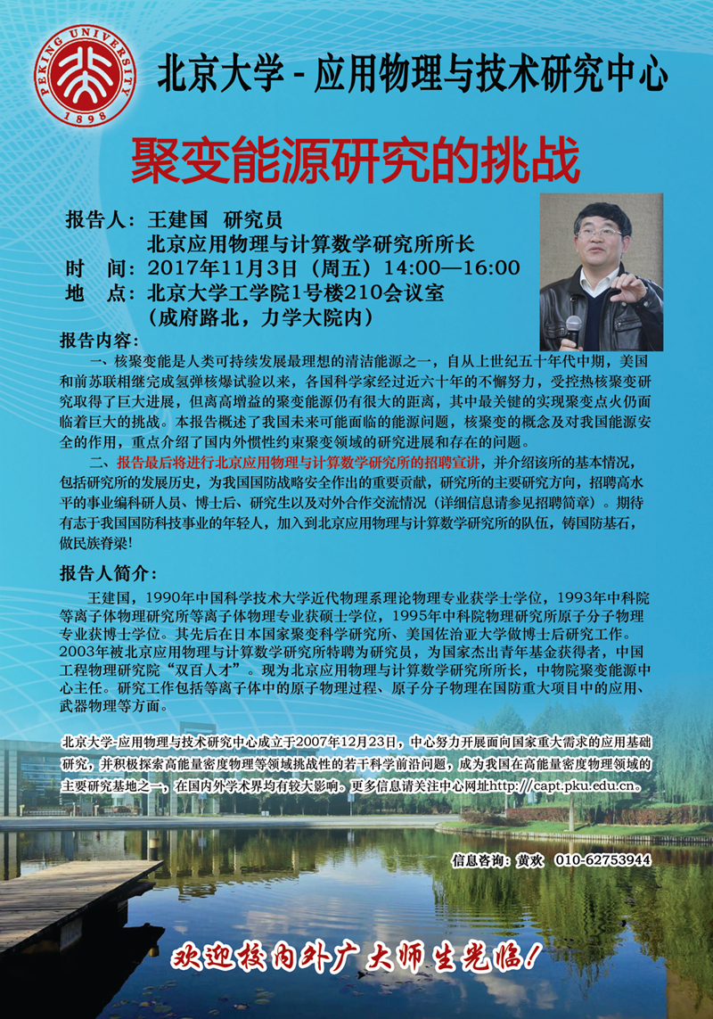 williamhill英国官网-中国工程物理研究院应用物理与技术研究中心荣幸邀请到了中国工程物理研究院下属单位北京应用物理与计算数学研究所所长王建国研究员来williamhill英国官网进行“聚变能源研究的挑战”学术报告及招聘宣讲。具体安排如下: