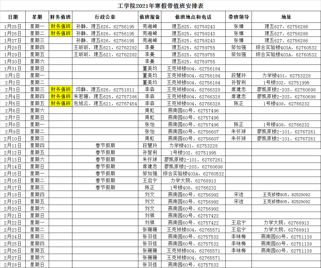 财务办公室寒假工作安排如下: 1、 寒假值班时间: 1月25-26日,2月3-5日 假期工作日对外办公时间上午9:00-11:30,下午1:00-4:30。 2、 2月酬金、劳务费、员工三助经费请于2月4日前提交至财务室(理科五号楼622),未按时提交的将在3月份转卡发放; 非值班期间,如有紧急财务事宜,请电联13683073902,提前祝各位同事春节愉快!