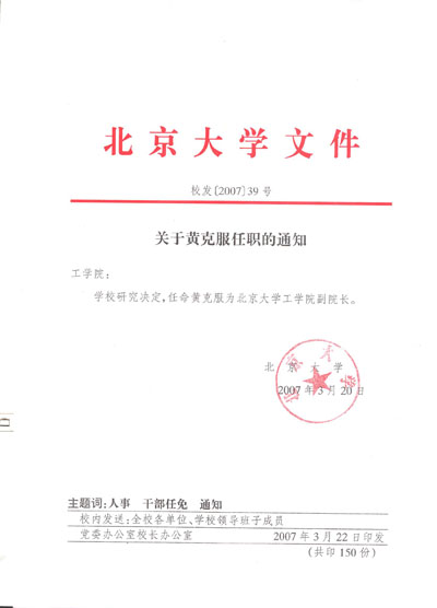关于黄克服任职的通知