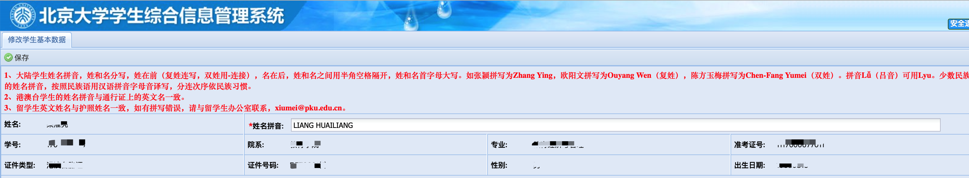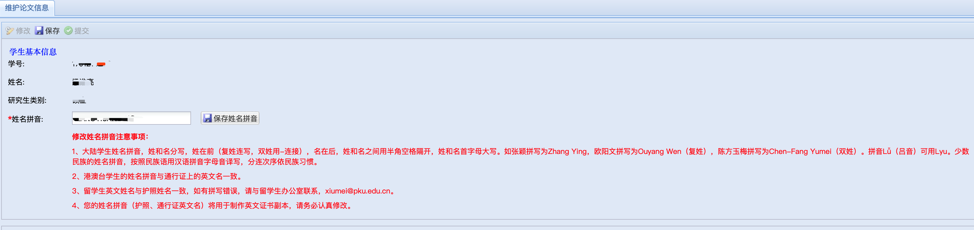 研究生校内门户中的姓名拼音信息将用于制作学位证书及英文证书副本,请务必认真核对并修改。如研究生不按期修改将会导致学位证书及英文副本上的姓名拼音信息错误。姓名拼音信息属于向教育部正式报送的重要学位授予信息,如在校学位会议审核学位后,发现学位证书及英文副本上姓名拼音有误,需经院系主管领导批准后报校领导审批,方可修改。