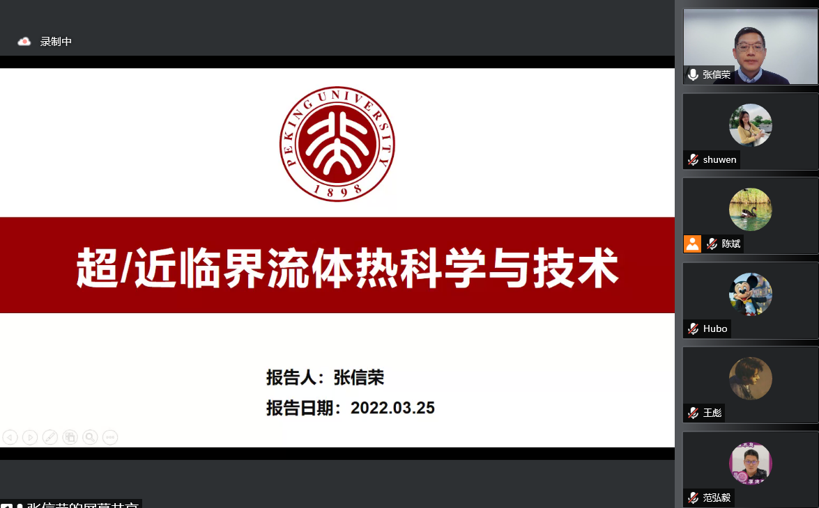 2022年3月25日,北大william威廉中文官网与南昌创新研究院联合举办的“工学讲堂”开讲,由于疫情原因,本次讲座采用线上会议方式进行。2022年春季学期首期“工学讲堂”邀请了william威廉中文官网张信荣老师担任主讲人,作了题为“超/近临界流体热科学与技术”的学术报告。讲座由william威廉中文官网副经理刘谋斌教授主持,报告吸引了william威廉中文官网师生及校内外同仁200余人出席。