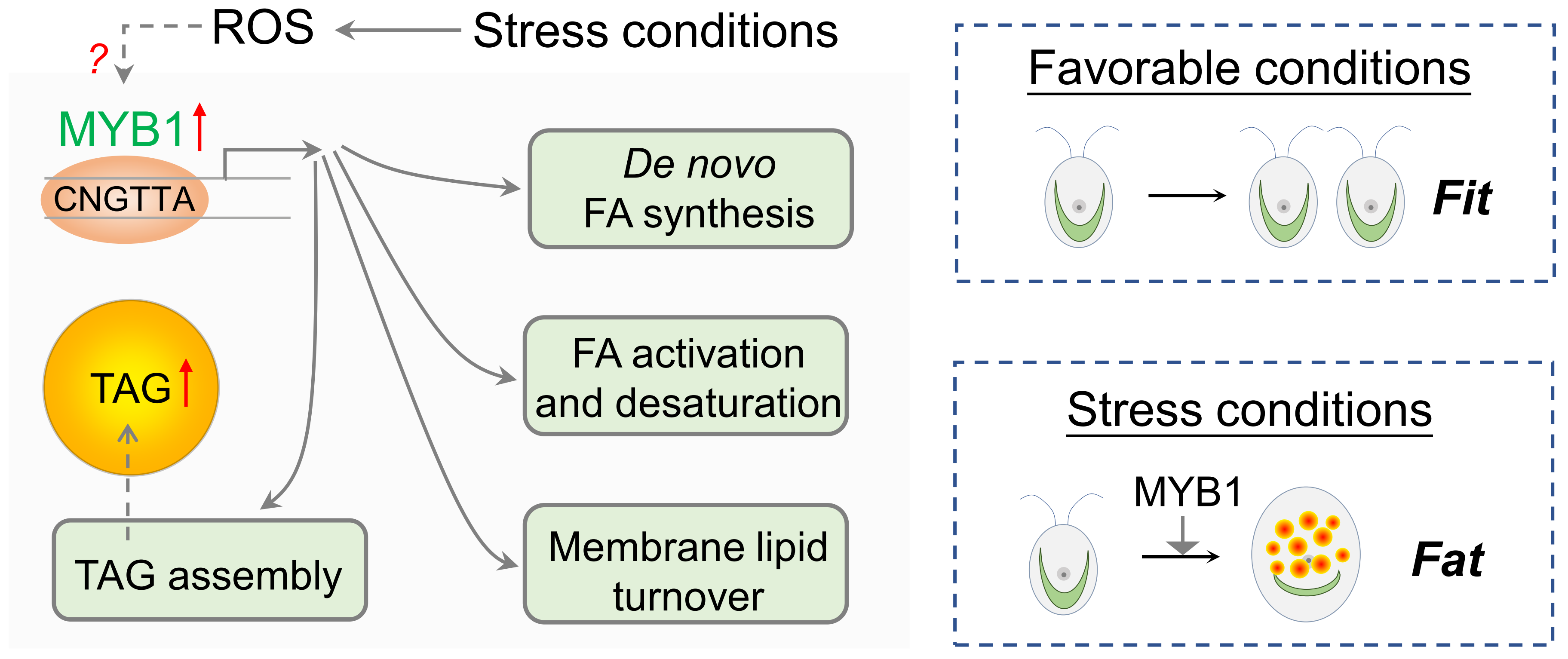 “浮光不解藻意浓,长照此间有时空,奈何体宽多油腻,只因身在困境中”。在营养充足和环境适宜条件下,微藻生长旺盛(fit状态);而当处于营养不足或者环境胁迫时,微藻生长受抑制,细胞变大并倾向于合成积累甘油三酯(fat状态)(图1)。 甘油三酯是一种常见的储能分子,也是生物能源的理想原料。 尽管已有不少关于微藻油脂代谢途径功能基因的研究报导,但在油脂代谢合成甘油三酯的转录调控方面仍所知较少。