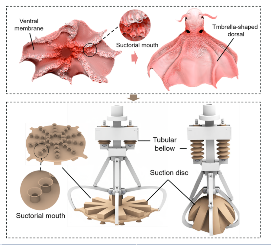 近日,谢广明教授课题组在期刊Advanced Science上发表了题为“Glowing Sucker Octopus (Stauroteuthis syrtensis)-Inspired Soft Robotic Gripper for Underwater Self-Adaptive Grasping and Sensing”的研究论文,介绍了一种灵感来自于发光章鱼 (Stauroteuthis syrtensis) 的软体抓取手,可以实现水下的自适应抓取和感应。