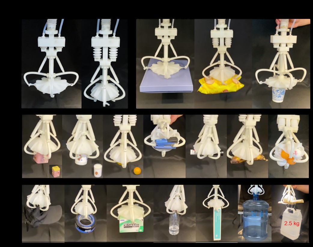 大多数章鱼只有柔性手臂,表面分布有粘性吸盘。不同的是发光章鱼的背膜覆盖了它的大部分臂长,形成独特的伞形,这样的特点可以通过防止动物从手臂间隙逃逸并增加抓取摩擦力来有效提高大物体和活体动物的抓取可靠性。在这项研究中,受发光章鱼捕食行为的启发,并借助 3D 打印和模块化浇注技术开发了一种新型软体抓取手,其几何结构和抓取能力与发光章鱼相似。抓手具有出色的吸力和抓取能力,可吸附和抓取多种形状(平面或非平面)和尺寸的物体、散落的多个物体、活体(乌龟和金鱼)、超重物体和超出抓取范围的物体等。此外,该抓取手可以利用吸嘴被覆盖时发生的流量变化而产生触觉感知能力,分辨出各种物体的尺寸。在浑浊的水下环境中,当机器视觉失效时,该抓取手的触觉可以发挥重要作用。未来,该软体抓取手在水下打捞、物流分类、流水线上异类物体的选择和放置等方面具有广阔的应用潜力。