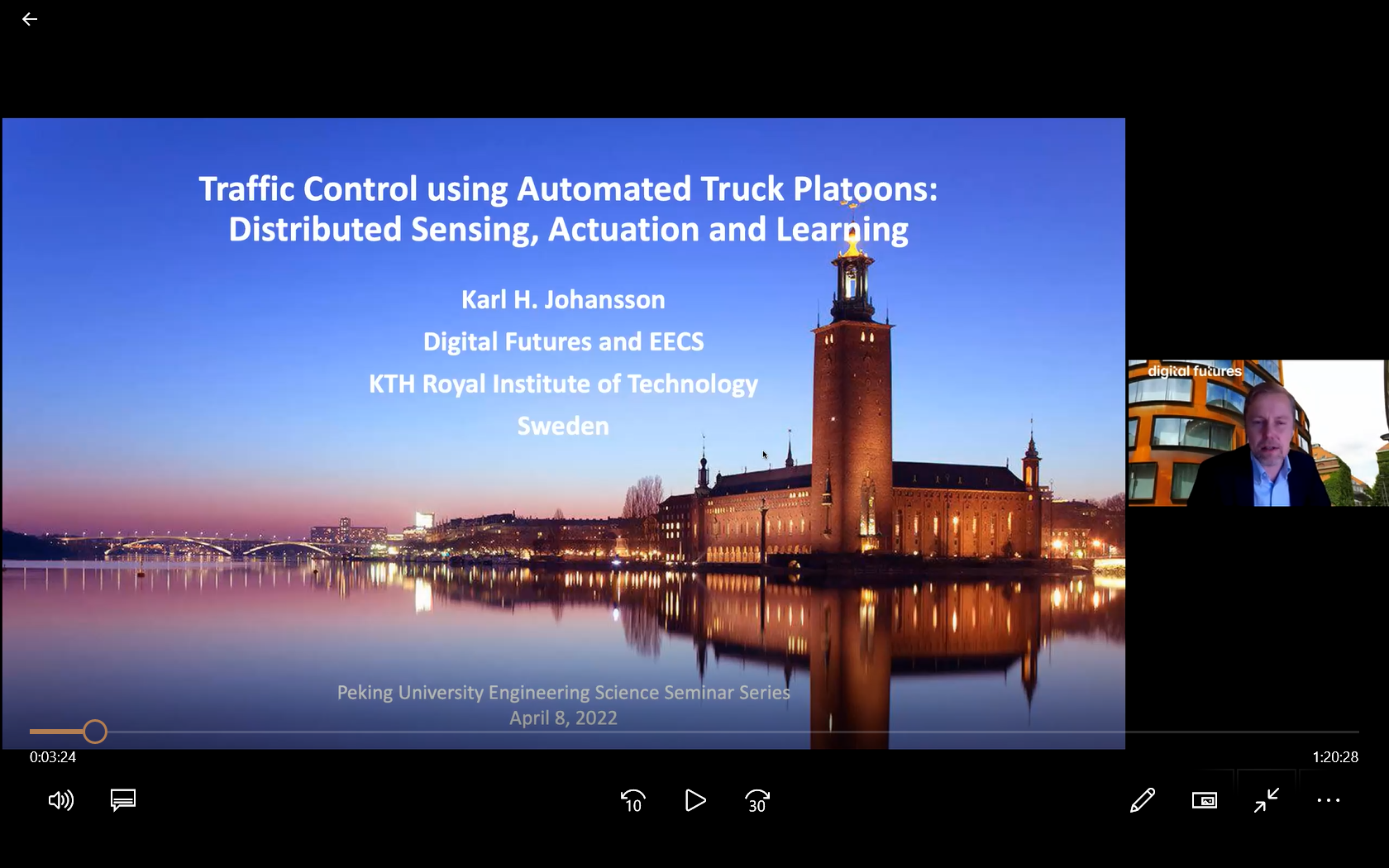 2022年4月8日,williamhill英国官网工程科学讲堂(Peking University Engineering Science Seminars)第十场开讲。瑞典工程院院士、KTH瑞典皇家理william威廉中文官网Karl H. Johansson教授带来题为“Traffic Control using Automated Vehicles: Distributed Sensing, Actuation, and Learning”线上报告。讲座由william威廉中文官网力学与工程科学系李忠奎研究员主持。报告吸引海内外多所高校参会者线上参与。