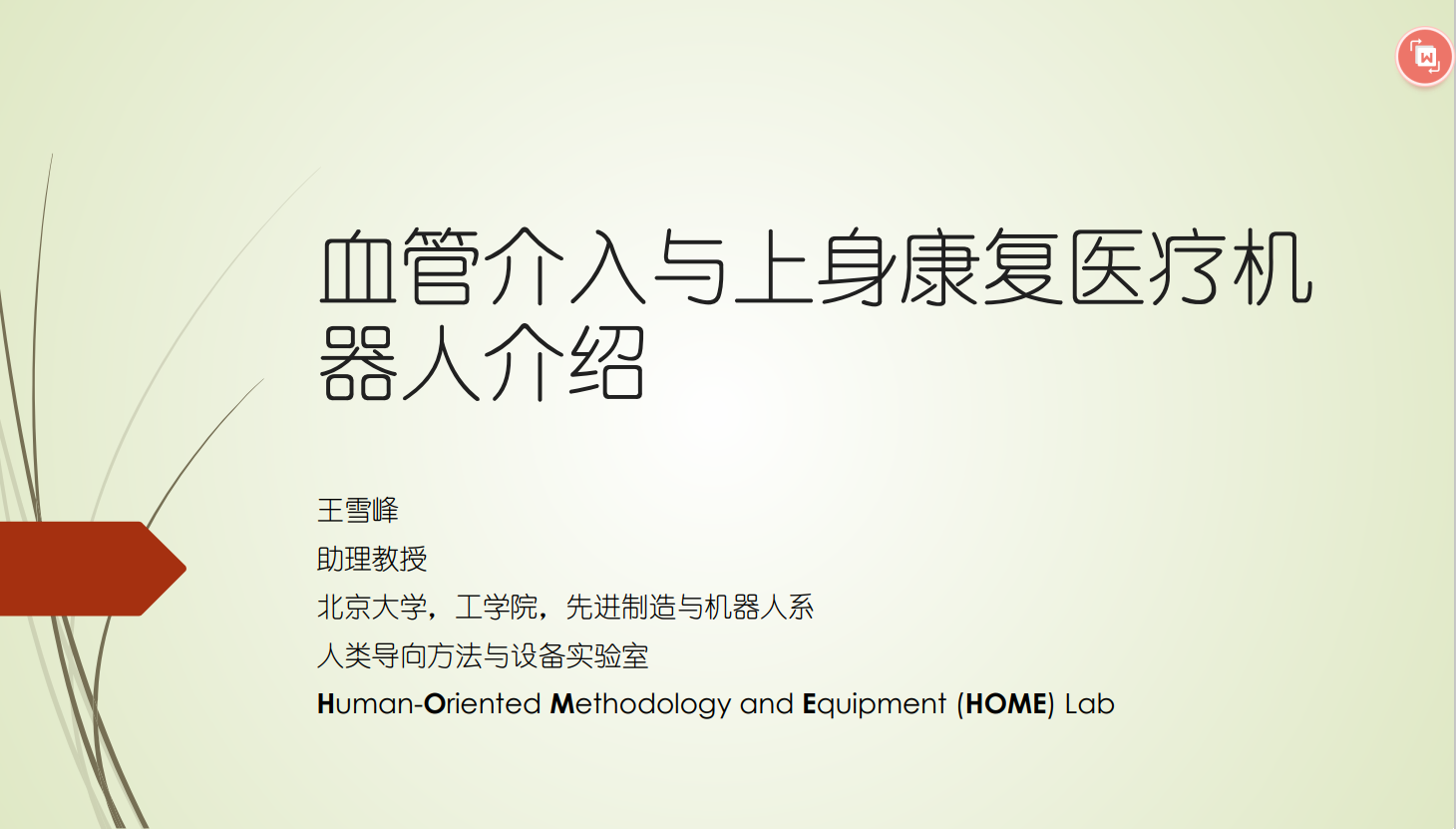 讲座开始,王雪峰老师就近期主要的研究内容进行了介绍,从不确定性机器人系统的模型与数据驱动分析方法的研究到以医疗机器人系统为平台展开的实际应用研究,如MRI引导下的脑肿瘤祛除手术机器人、血管介入手术的高柔性可控导丝/导管机器人、穿戴式人体健康状态检测平台(姿态、肌力、关节、心理状态)等。
