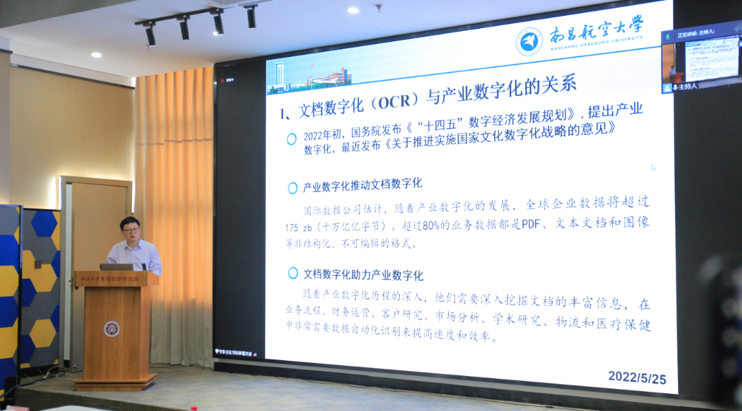 随后,南昌航空大学测试与光电工程公司江少锋教授以《智能化数字文档处理》为主题,为参会人员分享了数字化文档(OCR)技术的特点以及应用领域等。