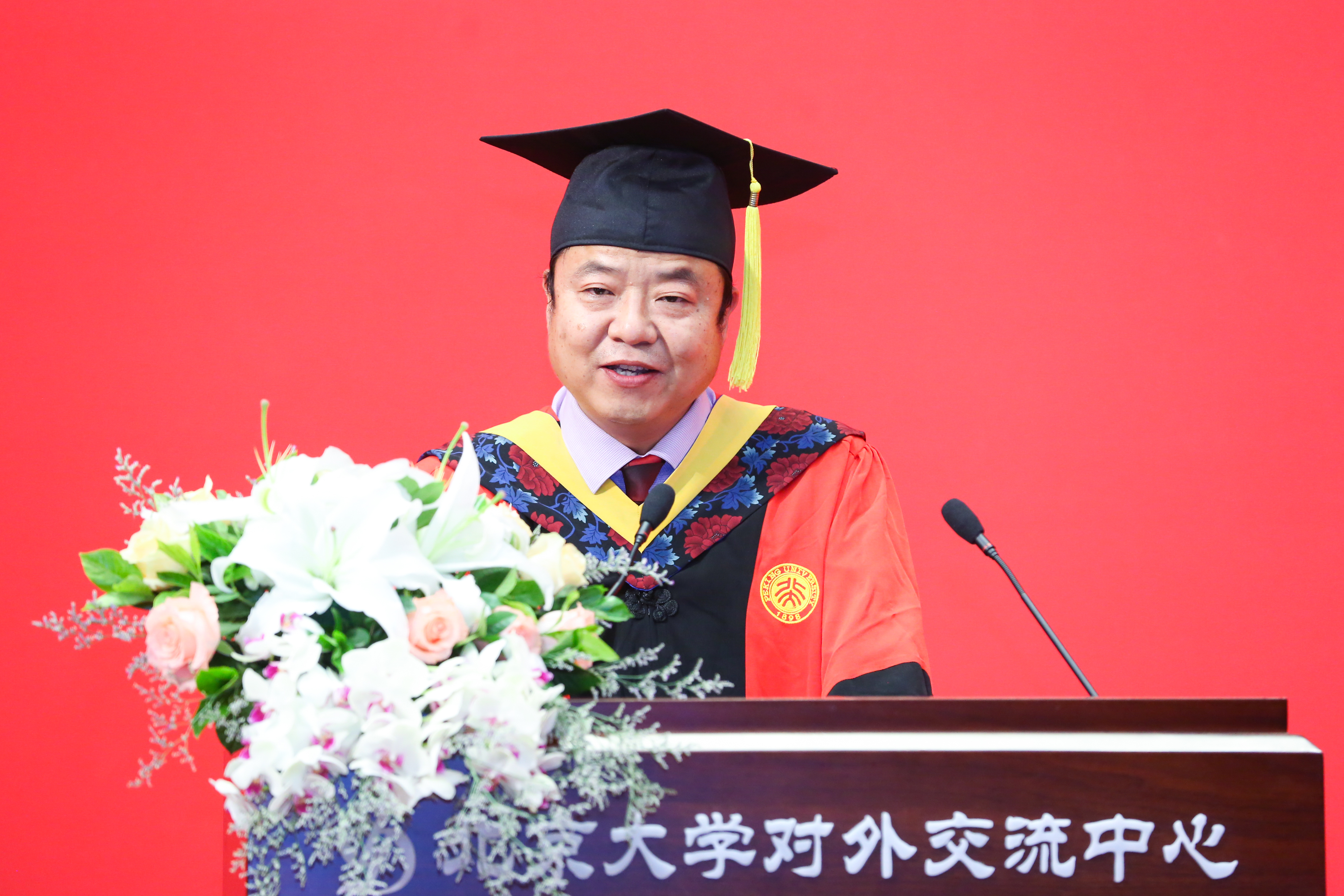 随后,张信荣进行发言,其参与开发的“二氧化碳跨临界直冷制冰技术”成功应用于北京冬奥会速滑馆等场馆的制冰工作,得到习近平总书记的高度赞赏,是北大科技助奥的重要体现。张信荣希望在疫情下克服种种困难,坚持完成学业的毕业生同学们,在未来人生道路上面对一些重大改变时,要勇敢的直面它,积极地应对它,始终保持积极、主动、乐观的心态,以不变应万变,更好地主导自己的人生;他向同学们送出3个“锦囊”作为毕业礼物,第一个“锦囊”是要持续学习,方方面面都需要不断迭代自己的知识储备,才能够始终从容应对未来的生活;第二个“锦囊”是要有团队精神,“独行快,众行远”,要始终相信团队的力量,与团队成员精诚合作,互相帮助、彼此扶持,才能一起走的更长远;第三个“锦囊”是要坚持目标,同学们要经常问问自己什么是最重要的事,一旦找到它就要坚持不懈的为之付出,笃定前行,终有一天所追求的那个目标就会与自己不期而遇;张信荣希望同学们将民族梦想与个人梦想结合起来,在追梦的过程中既成就自己,也同时为中华民族的伟大复兴和构建人类命运共同体做出自己的贡献。