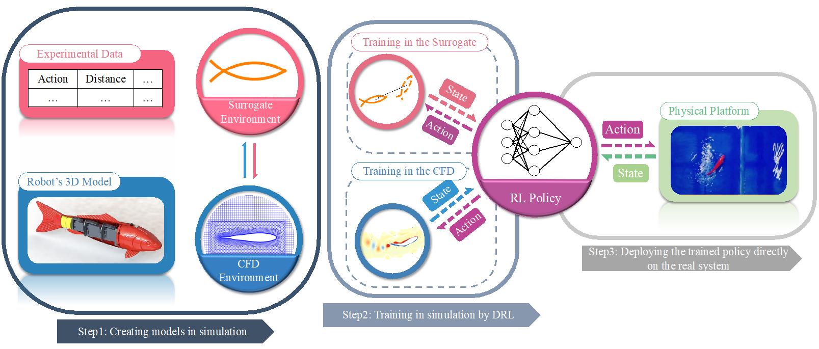 在仿真环境中训练得到的强化学习策略往往在现实世界中表现并不理想。因为仿真环境和现实环境必然存在差距。减少这种差距意味着仿真精度的提升,这会大大增加计算时间,从而延长强化学习方法的训练周期。为了解决这一问题,如图1所示,该工作所提出的框架会先在基于数据驱动的仿真环境中训练强化学习策略,从而快速获得基本掌握执行任务的能力,然后会在更为精确的基于流体力学计算(CFD)的仿真环境中完善,以提升运动控制性能。这样一种方式平衡了模拟与训练的速度精度,使得策略能够被高效设计并直接部署到机器鱼上,从而在现实世界中完成相应的任务。
