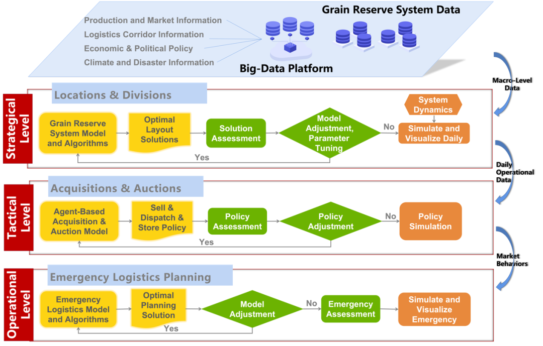 为兼顾系统运作经济性的情况下提升粮食应急保障能力,研究团队针对我国粮食应急保障体系中面临的战略布局、优化运作与应急调度三大问题,通过定性研究与定量研究相结合,采用不同的数据驱动方法进行问题建模求解,以优化系统运营经济性和应急响应能力为目标,充分考虑粮食储藏特性、经济特征和代储企业行为特征。