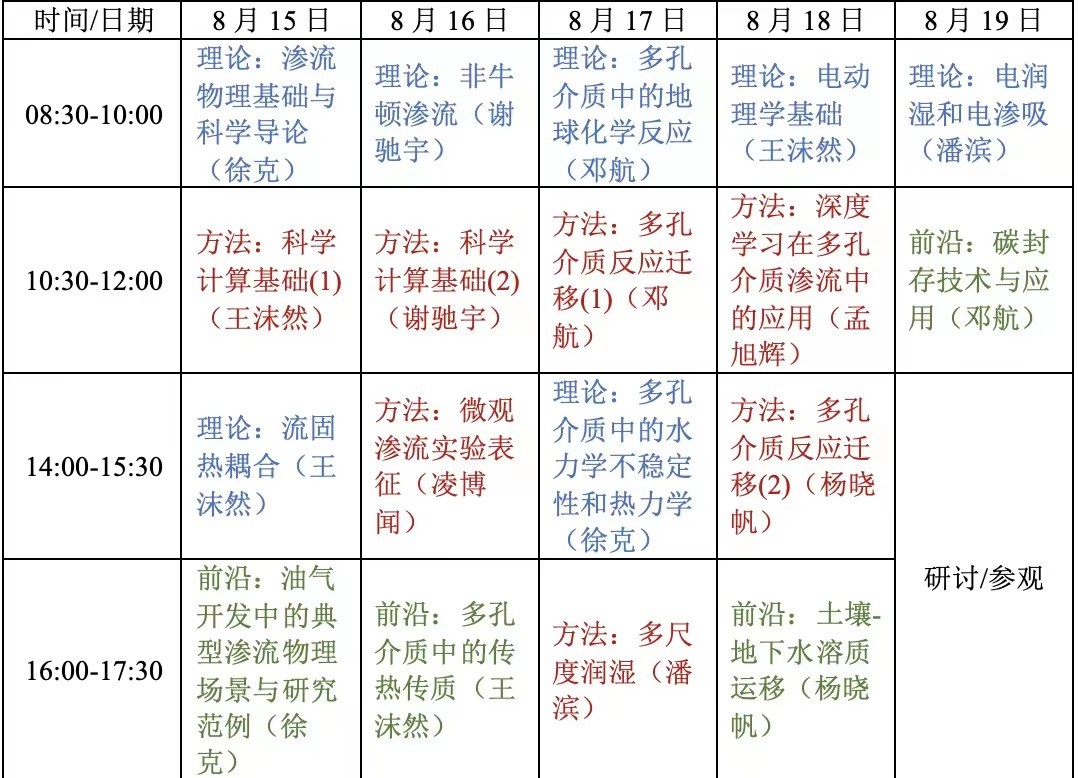 本届暑期公司为期五天(8月15-19日),包括理论课、方法课、研讨课和前沿讲座共计19次,累计38学时。课程通过专题授课的方式系统介绍了渗流物理基础、流固热耦合、多孔介质中的反应迁移、地球化学反应、电润湿和电渗吸等理论内容,以及利用科学计算、微流控实验、深度学习等手段进行渗流物理研究的方法和基本原理,并通过前沿讲座使参与师生更清楚地了解了渗流和多孔介质输运领域的最新研究进展。