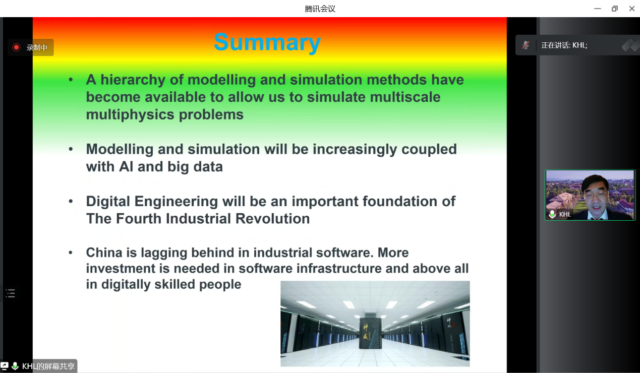 在此次报告中,罗教授首先回顾了广泛应用于工程分析、预测、设计和优化的计算流体动力学模拟(CFD)的发展,然后侧重介绍介观和微观尺度模拟方法(如LBM和MD)对传统宏观方法的补充,使多尺度多物理模拟变得越来越强大。机器学习扩展了可以通过计算解决的复杂问题的范围,人工智能、物联网、虚拟现实、增强现实、数字孪生等数字工程的发展,预示着第四次工业革命的到来。罗教授最后提到,当前的工程研究和工程教育必须适应即将到来的挑战,建模与仿真技术既需要数据驱动也要基于物理过程。罗教授提出未来工程师所需的关键技能,并鼓励大家在我国工业软件发展方面做出贡献。