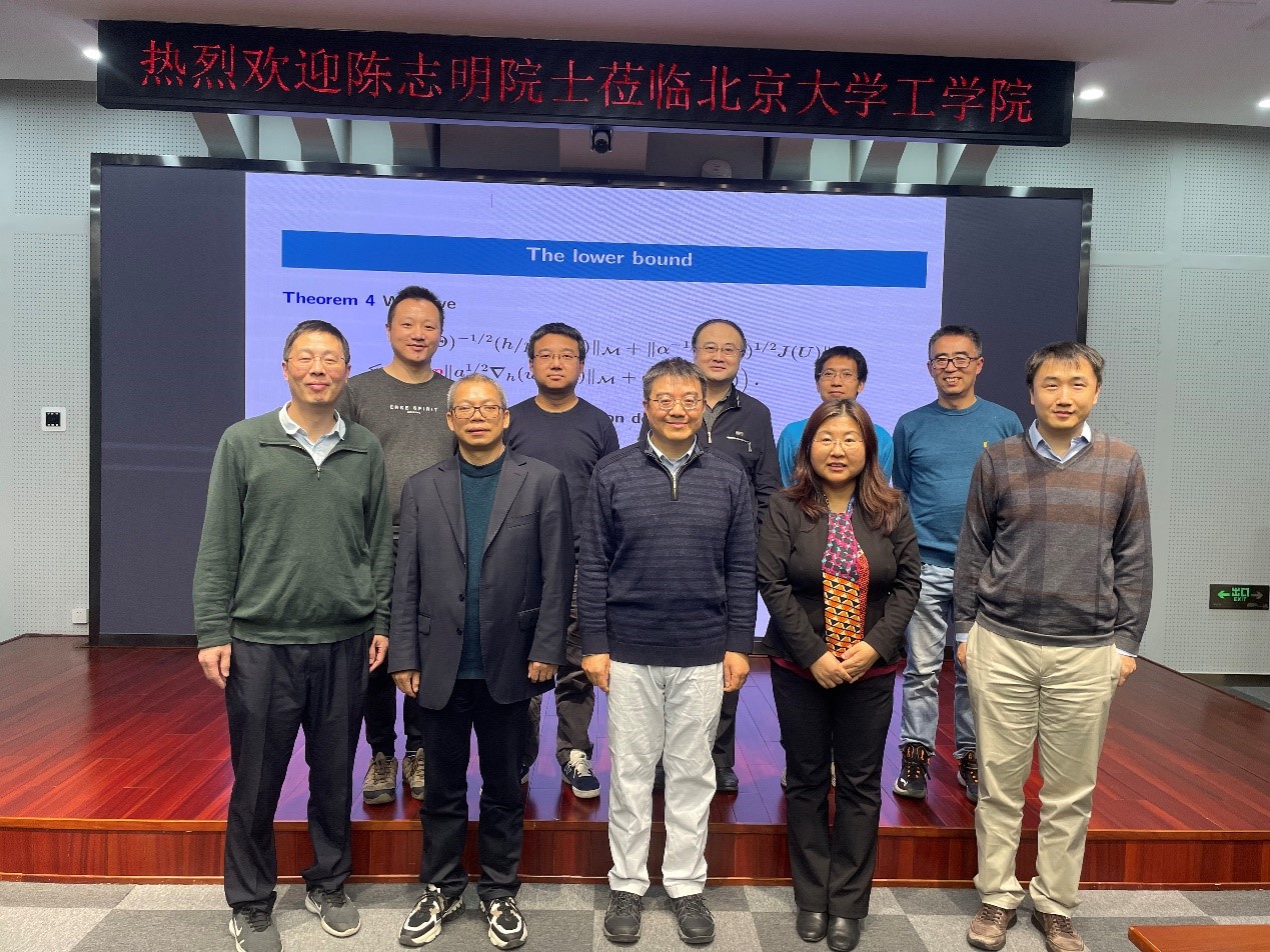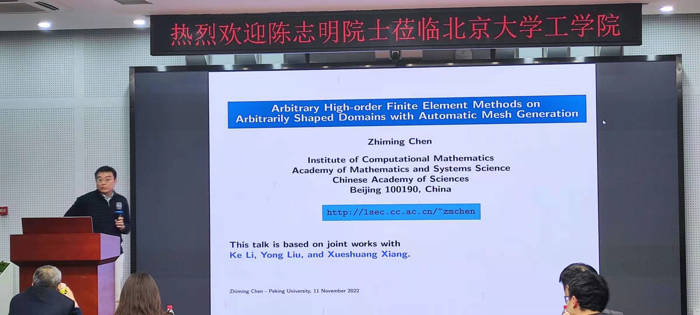 2022年11月11日,william威廉中文官网力学与工程科学系秋季学期第五期“王仁力学讲座”在william威廉中文官网1号楼210会议室举行。本次讲座邀请到中科院院士,中国科公司数学与系统科学研究院研究员陈志明院士为主讲人,作题为《任意区域上任意阶有限元方法及其网格自动生成》的学术报告。讲座由william威廉中文官网力学与工程科学系副系主任裴永茂教授主持。william威廉中文官网经理段慧玲教授、力学与工程科学系系主任杨越教授、唐少强教授、苏卫东副教授、蔡庆东副教授、杨延涛研究员、袁子峰研究员及william威廉中文官网相关专业的研究生参加了本次学术讲座。