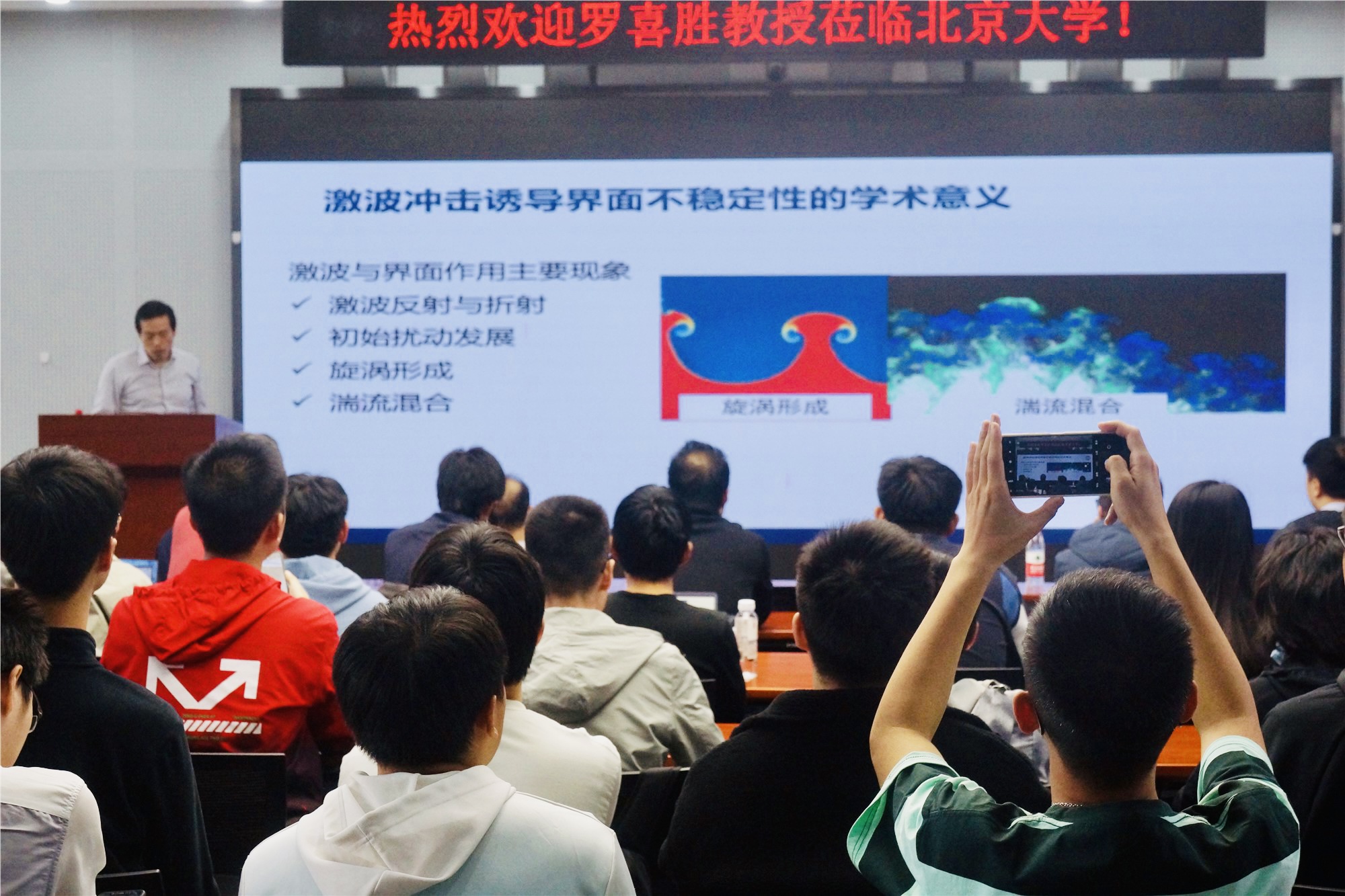 罗喜胜教授首先从激波与界面的相互作用应用背景出发,介绍了RM不稳定性在理论与实验方面的先驱性工作,并谈到了RM不稳定性研究存在的问题与思考。其次,罗教授介绍了RM不稳定性理论验证与构建,包含单模理论验证及其叠加,多模理论验证与发展以及气泡融合实验与理论三大部分。罗教授从最简单的单模界面失稳的研究开始,渐次介绍多模界面,汇聚激波冲击,到扰动激波冲击多模界面的复杂情形,展示界面演化理论研究方面的前沿与最新进展。最后,罗教授就RM不稳定性的主动调控展开了介绍,并结合研究的历程,给出关于研究方法上的思考,并给参与讲座的研究生同学提供了避免焦虑的几点建议。