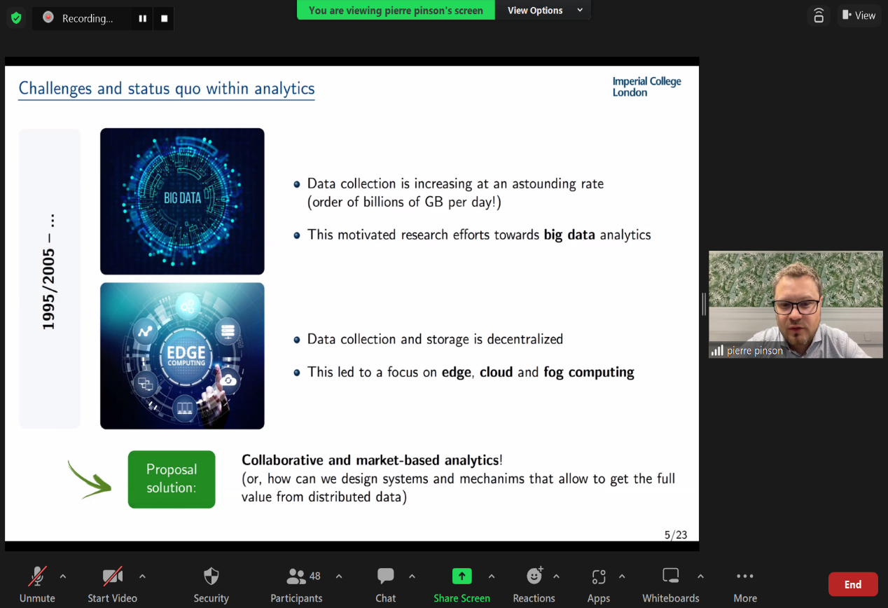 在此次报告中,Pinson教授首先介绍了数字经济中能源、城市、工业、交通、农业等各个系统运营对于大数据分析的依赖,以及目前由于数据来源和供应分散、缺乏激励数据共享的机制对大数据分析造成的困难与挑战。Pinson教授以电力市场中各参与者通过共享数据特征优化彼此的回归预测模型的回归任务为例,并结合南卡罗来纳州的风力发电场景,介绍了数据市场(Data Market)和分析市场(Analytics Market)在促进数据共享流通方面的优劣,阐述了在数据隐私越来越被注重的当下,数据市场的设计与建设思路。报告重点在于探讨激励能源数据共享,利用数据共享价值驱动数据交易,并通过数据交易获利带动产业发展。报告最后,听众与Pinson教授进行提问互动,并期待将来邀请Pinson教授来访进行面对面交流。