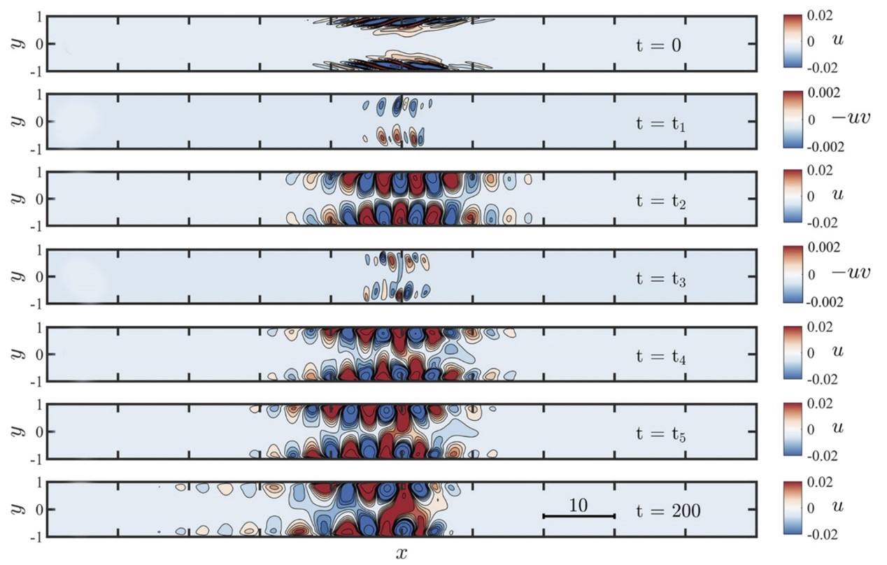 图1. 二维槽流中最优扰动演化为转捩特征结构局地波包的第一、二阶段。 u和v分别为流向和法向扰动速度。雷诺数Re=3000,(t1, t2, t3, t4, t5)=(8.90, 13.55, 17.16, 22.89, 37.78)。[1]