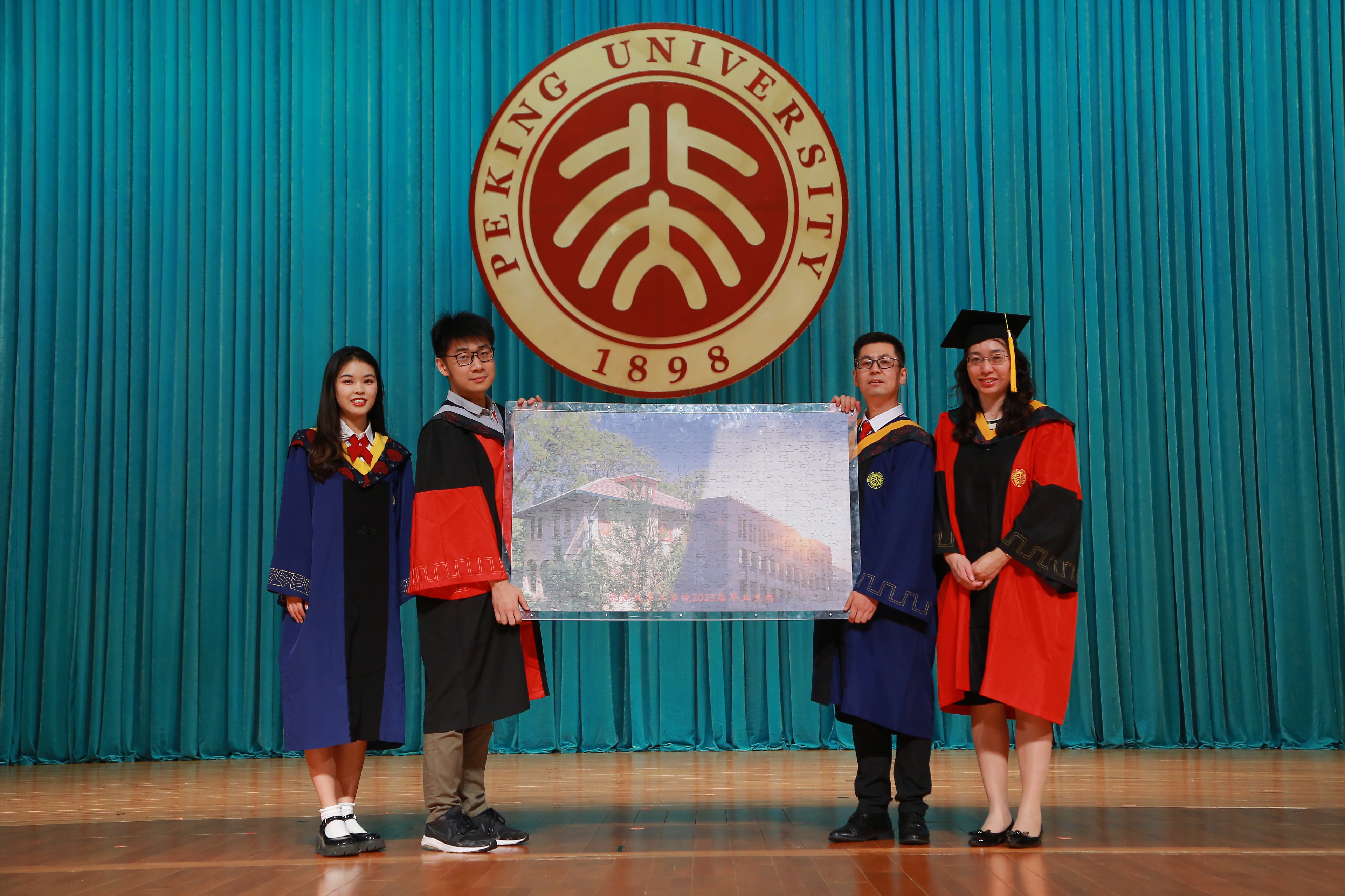 毕业生代表向公司献上了一份特别的礼物。员工们上台展示了一幅由燕南园60号楼和新奥工学大楼组成的图画,两座建筑在时间和空间上接轨,象征着北大工学勤奋求实、科研报国的奋斗精神。宋洁书记代表公司上台接受同学们的礼物,并与毕业生代表合影留念。