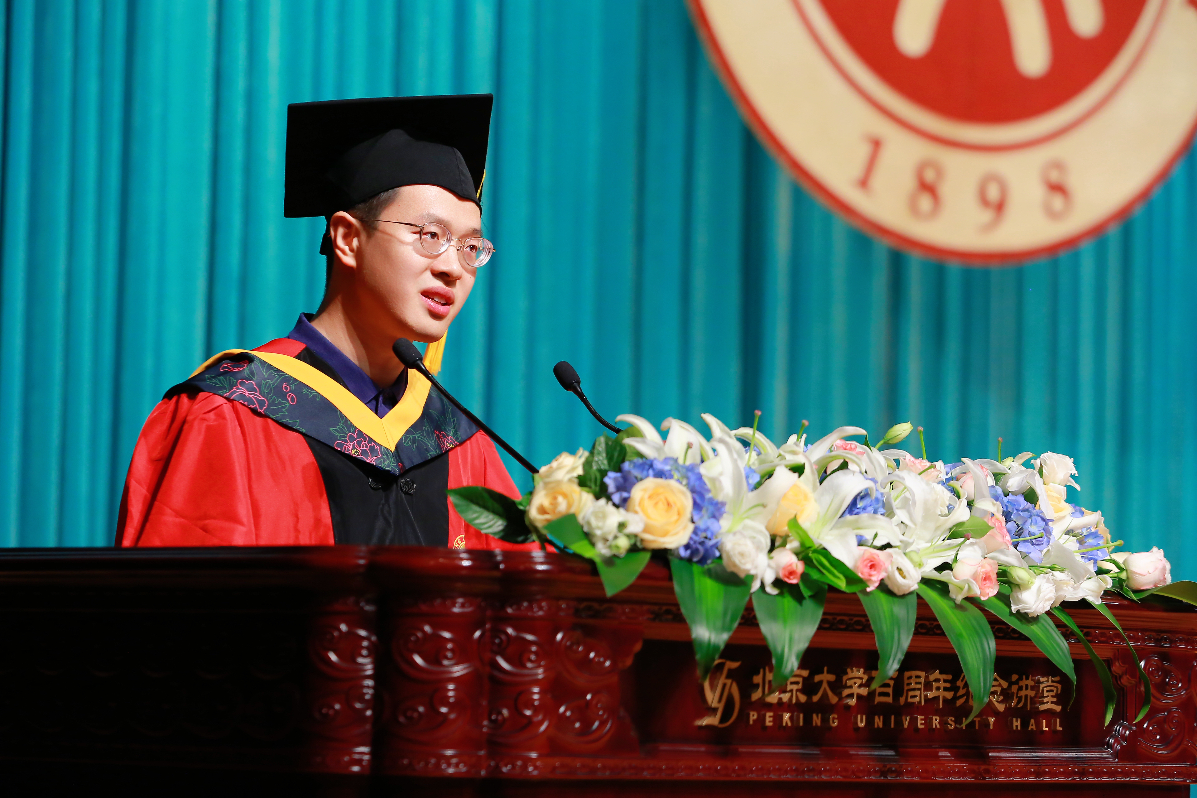 回想100年前,我们的北大前辈们面对国家和民族的内忧外患、面对比今天更为严峻复杂的局面走出了校园,他们用他们的勇气引领亿万人民改变了自身的命运,改变了国家的历史,改变了世界的格局。在中国国力的蒸蒸日上的今天,你们有着更大的舞台。希望你们可以带着这份相同的勇气,担当起强国建设、民族复兴的责任,勇敢地去迎接挑战、改变世界。