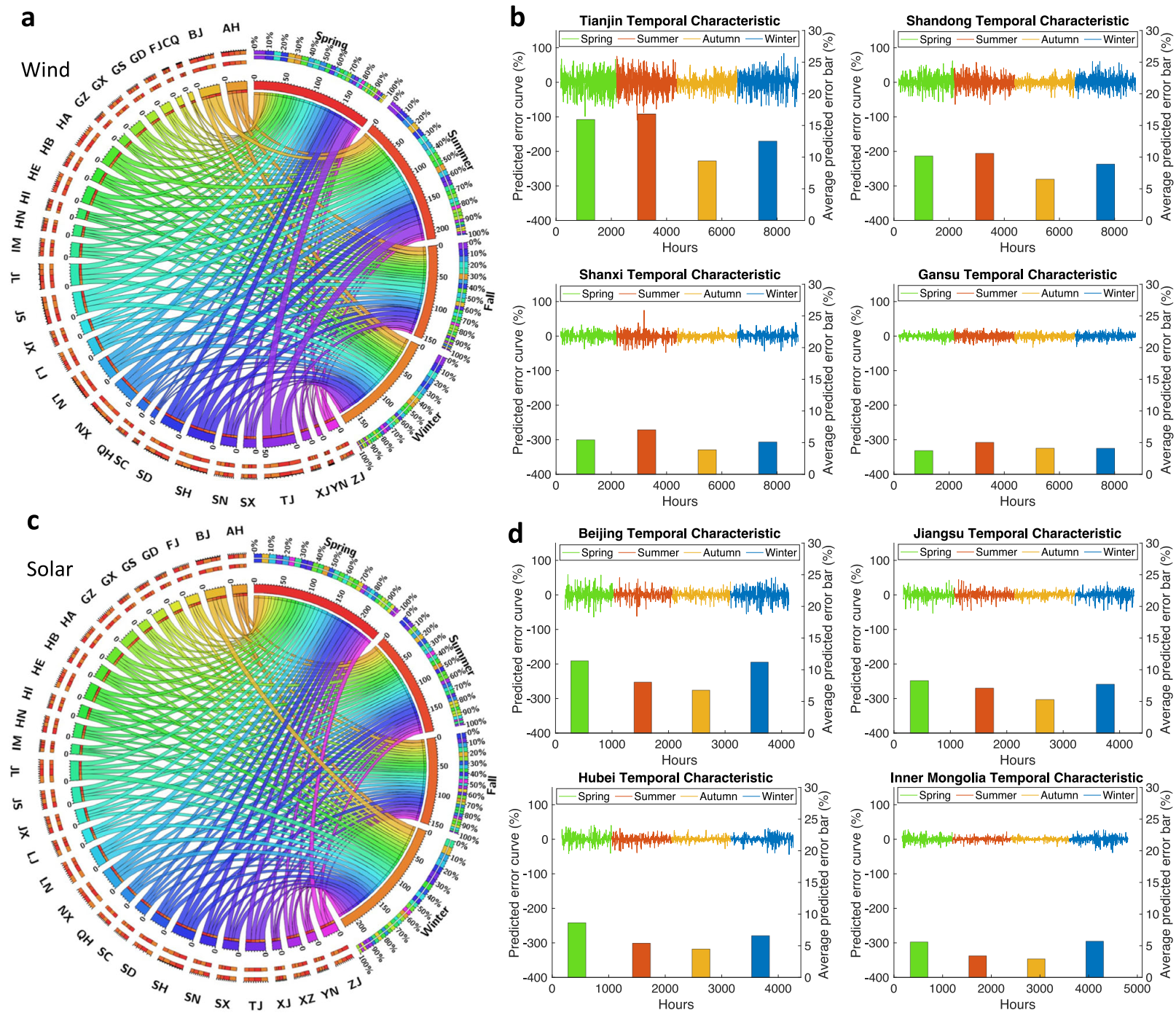图2: a不同季节各省风电预测误差;b 典型地区风电预测误差季节性规律;c不同季节各省光伏预测误差;d典型地区光伏预测误差季节性规律