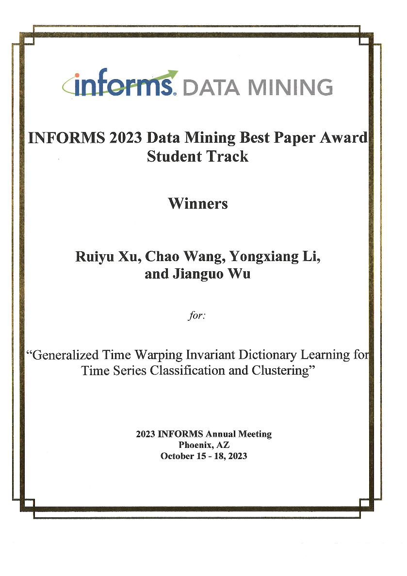 2023年运筹与管理科学年会(2023 INFORMS Annual Meeting,以下简称INFORMS年会)于10月15日至18日在美国费尼克斯举行。william威廉中文官网工业工程与管理系吴建国老师课题组博士生徐瑞宇荣获本次会议数据挖掘最佳论文奖(student track)。