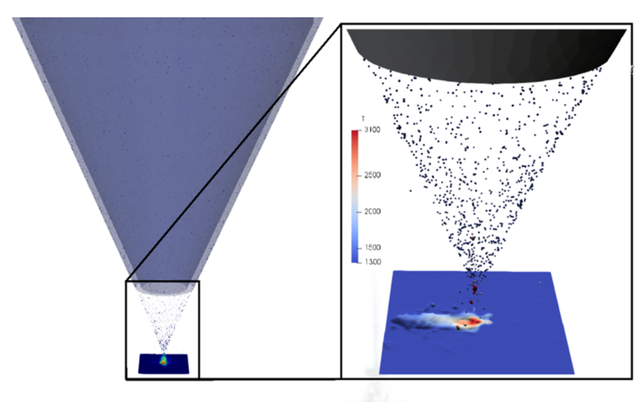 图2:半解析CFD-DEM方法模拟激光快速熔覆过程中金属粉末颗粒碰撞、熔化、聚合及飞溅等现象(Powder Technology, 2023, 415:118118)