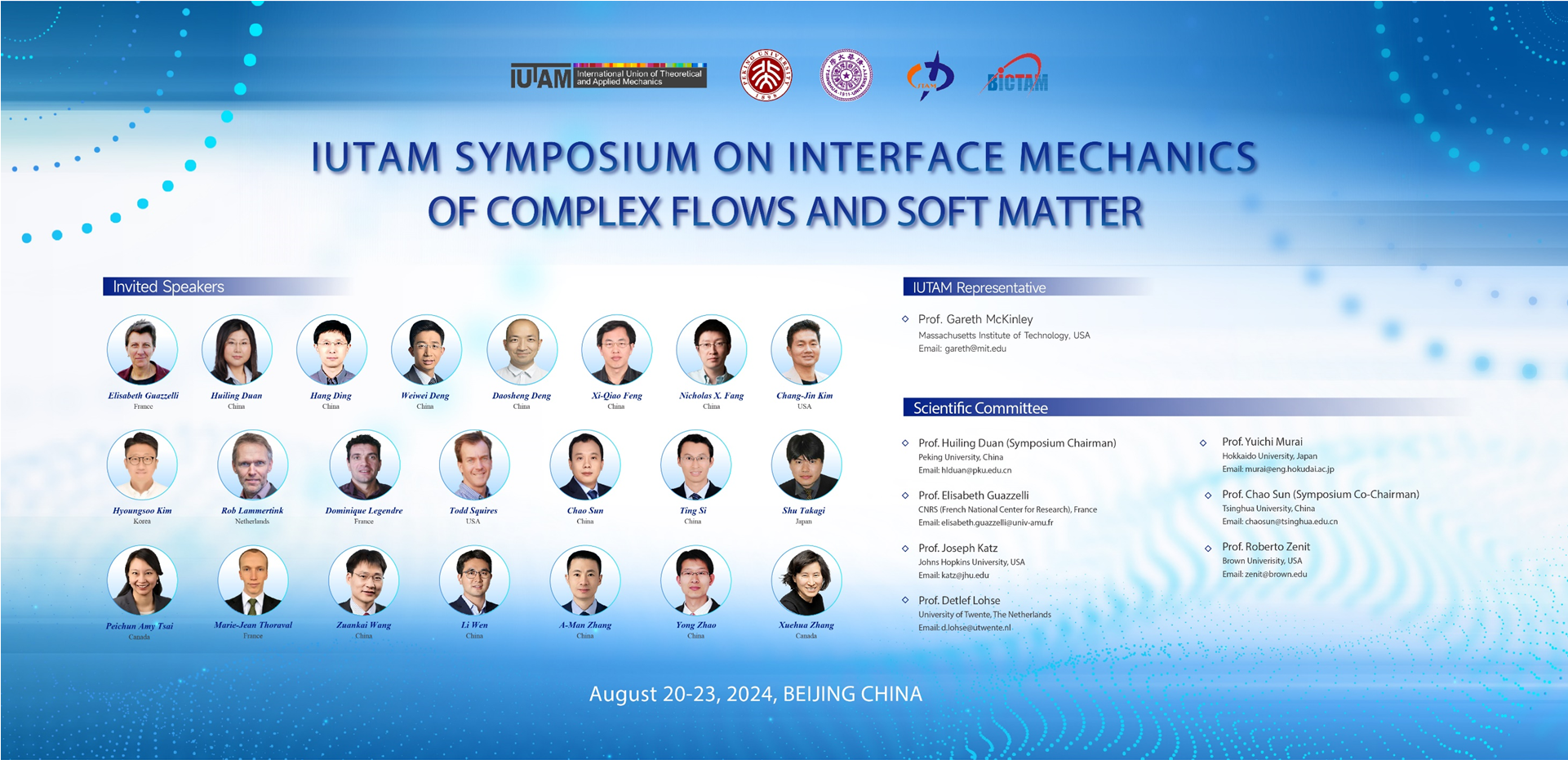 2024年8月20日至23日,国际理论与应用力学联盟(IUTAM)“复杂流动与软物质界面力学”国际研讨会(IUTAM Symposium on Interface Mechanics of Complex Flows and Soft Matter)在williamhill英国官网成功举办。本次研讨会由国际理论与应用力学联盟(IUTAM)主办,williamhill英国官网和清华大学承办,并得到中国力学学会和北京国际力学中心的支持。会议由williamhill英国官网段慧玲院士和清华大学孙超教授共同担任大会主席,旨在交流讨论复杂流动和软物质界面力学的基本问题和主要挑战,为从事相关领域的专家学者们提供一个高质量的国际学术交流平台,促进全球不同国家领域学者进行思想交流,助力多相流与软物质界面力学等领域的发展。