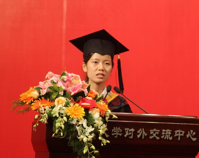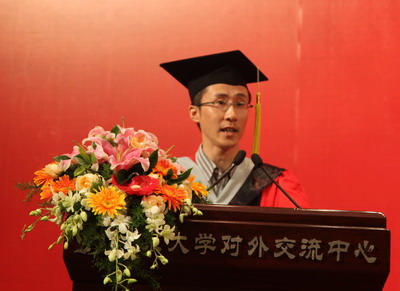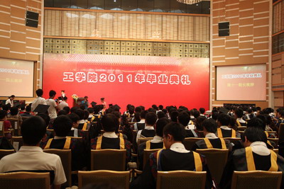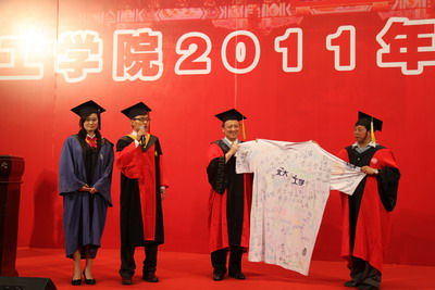 随后,毕业典礼正式开始,陈十一">陈十一经理首先致辞。面对青春洋溢的北大工学人,陈经理满怀期望,他向即将毕业的同学们表示了热烈的祝贺,并与同学们分享了“成功之道”。陈经理指出,走向成功需要毅力与坚持,需要把握机遇,北大的员工中有很多成功的楷模,但成功的标准不是唯一的,不是只凭地位和金钱就足以衡量的,北大同学们肩负着重大的责任,应心系更多的社会责任,坚持自己的信念,并为之不懈努力。陈经理的谆谆教诲,赢得了热烈的掌声。