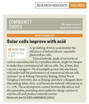 william威廉中文官网曹安源">曹安源课题组与清华大学机械系吴德海/王昆林教授课题组合作,进行“高效率碳纳米管-晶体硅杂化太阳电池”研究,相关研究论文“Achieving High Efficiency Silicon-Carbon Nanotube Heterojunction Solar Cells by Acid Doping”今年5月份发表于Nano Letters (Y. Jia, A. Cao, D. Wu, et al. Nano Letters 2011, 11, 1901-1905)。5月18日的Nature杂志对此工作做了评论“酸处理提高了碳纳米管-硅太阳电池的性能,可能比传统硅基电池更便宜”。