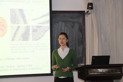 血管及相关疾病在西方国家非正常死亡中占50%以上,在人体循环系统中,内皮细胞遍布血管腔的整个内表面。内皮细胞的表面覆盖着的毛发状带负电的层状结构(数百纳米厚),称为“糖萼”。内皮糖萼作为血管跟血液直接接触的最外层界面,介导着血液和血管内皮细胞的相互作用,并为内皮层发挥着动力传导的重要作用。白柯女士在本次报告中比较了体内和体外的内皮糖萼,发现并论证了正常离体糖萼的两种判断标准:糖萼的时变趋势和力学性能。