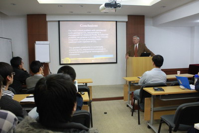 Surdam教授从怀俄明州的能源资源和地质概况出发,阐述了CCS项目在地质选址方面应当考虑的因素,并分析了CCS项目商业化运作的可能性以及遇到的主要挑战。Surdam教授指出,CCS项目的成本很大一部分产生于封存前的CO2捕捉,一个完整的CCS项目“购买”CO2的成本远比封存CO2的成本高,这是CCS商业化发展最主要的瓶颈。因此,我们必须发展降低CO2捕捉成本的技术,统筹各碳排放企业,并建立基于CO2封存的多功能综合项目,以此提高收益,实现商业化运作。Surdam教授精彩的讲座使在座同学受到新的启发。