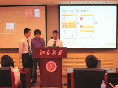 随后,答辩正式开始。按照规则,六个团队先后进行成果展示,包括15分钟的成果报告和10分钟的回答观众提问。王超、杨月勇同学所在的Nokia Family团队旨在解决远距离交流沟通的不便,设计出帮助人们维持生动、亲密、方便交流的电子应用程序与设备。谭君子、刘思颖同学所在的Wrigley团队的目的,则是为箭牌公司的益达品牌设计出适应中国市场的新一代包装,其最终设计满足了噪音削减、易于分享、清洁回收、口腔卫生等一系列消费者需求。苟金平、薛斌同学所在的AHA(美国心脏协会)团队旨在解决如何在中国有效开展CPR(心肺复苏术)应用的问题,经过充分的调研,他们最终设计出包括社区服务、教育项目、游戏项目等一系列措施的高度可行方案。文晓、黄盈同学所在的Intel团队旨在解决普通百姓看病难的问题,其最终设计——电子病历具有电子记录、互动诊断等诸多特点。胡锦文、卢彦威同学所在的Nokia Education团队则通过对诸多农民工小学的实地访问和调研,设计出包括社区捐助等多个内容的捐赠系统,希望可以解决农民工子弟小学的资金与发展问题。王若思、吕佩涛同学所在的Herman Miller团队旨在为老年人设计出符合其使用习惯与生活需求的新一代家具,通过在敬老院、老人家庭的考察与访问,他们最终设计了一款来自于舞蹈灵感,满足了舒适、健身与按摩需求的座椅。