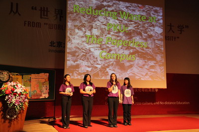 之后,来自该课程的24位中美学子分为6个研究小组,展示了他们的研究成果,即主题为“如何用文化的差异来刺激创新思维,以协助北大建设绿色校园”的创新成果。他们通过在北大的短期调研,发现了水电浪费、自行车废弃、海报垃圾等问题,并提出一系列可行的策略。他们发现问题的眼光让人赞赏,这也正是此教学项目力图培养的员工的一项能力。同学们精彩的展示赢得了听众热烈的掌声。