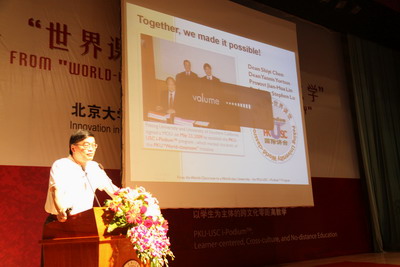 本次展示会上,北大提出了“建立‘世界课堂’(World Classroom),推进北大本科教育改革,构建多样化、全方位本科人才培养体系”的战略目标,同时以“北大—南加大‘国际讲台’( i-Podium™)”合作教学项目为例,展示了一个二十一世纪当中教育国际化的创新模式,一个“以员工为主体、跨文化而零距离”的全新教学方法和学习环境。