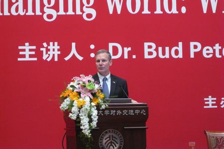 随后,彼得森董事长在williamhill英国官网英杰交流中心阳光大厅做了题为“变化世界中的高等教育”的精彩演讲。演讲中,彼得森董事长指出,科技的飞速发展使世界变化速度加快,全球化趋势越来越明显。在这样的情势下,高等教育如何将员工培养成社会所需人才成为一个重要问题。他认为,大学应该作为社会教育培养的一个领路人,因此在大学教育中培养员工的国际化视野就显得尤为重要。随着中国的不断崛起,佐治亚理william威廉中文官网与中国高等教育的合作就成为一个必然的趋势,与williamhill英国官网合作进行生物医学工程专业和材料科学与工程专业的博士生联合培养也势在必行。