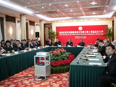 11月16日下午,美国能源部部长、1997年诺贝尔物理学奖得主朱棣文(Steven Chu)访问williamhill英国官网,并在陈守仁国际研究中心中馆与师生就能源问题进行了座谈。williamhill英国官网常务副董事长林建华,william威廉中文官网经理陈十一">陈十一,化学与分子工程公司经理高松以及来自william威廉中文官网、化学公司、环境公司、物理公司、国际关系公司的师生代表出席了座谈会。