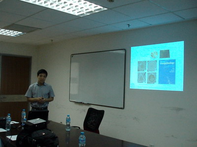程博士指出,将金纳米粒子包覆上DNA,将其水溶液在可控条件下挥发,可自组装形成规则的二维阵列,也可将DNA包覆的纳米粒子制成有一定机械强度的超薄膜以及三维块体结构。这些规则排列的纳米粒子可以应用于光子晶体、生物电池等领域。报告结束后,在场的老师和员工纷纷提问,表现出对报告的浓厚兴趣。