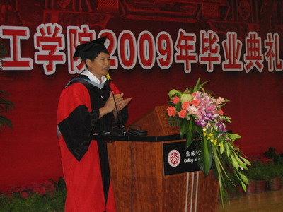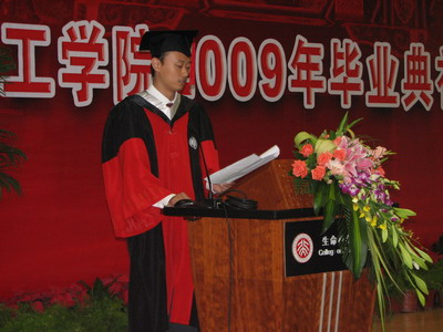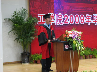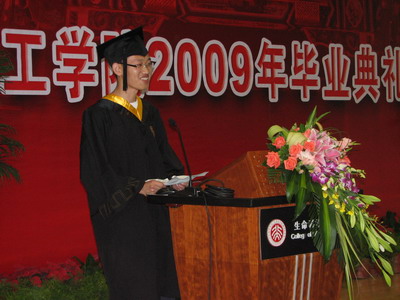 经理在致辞中首先祝贺所有的毕业生圆满完成学业,并向支持他们的父母和亲友表示感谢。陈经理指出,在波及全球经济危机的影响及中国经济企稳回升的关键时期,毕业生们面临着如何规划自己职业生涯的问题。对此,他提出了三点期望鼓励同学们要在新的起点上重新出发;要有勇有谋;要保持北大人“常为新”的传统。“雄关漫道真如铁,而今迈步从头越”,陈经理最后祝福大家前程似锦、创造光辉灿烂的明天。