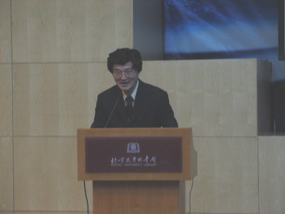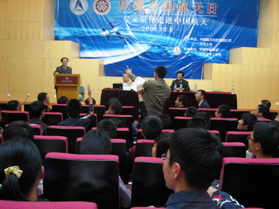 5月8日晚,由中国航天科技集团公司和williamhill英国官网主办,中国宇航学会和北大william威廉中文官网承办的“庆祝中国航天日-专家带你走进中国航天”专题报告会在北大举行。神舟七号飞船专家组成员、航天科技集团空间技术研究院李颐黎研究员作了“中国首次出舱活动-神舟七号载人飞船研制情况介绍”的报告。著名的火箭控制系统专家、航天科技集团顾问、原航天科技集团总工程师、中科院梁思礼院士做了“中国航天技术的回顾与展望”的报告。晚上7点,图书馆北配殿报告厅座无虚席,挤满了对中国航天满怀热情和憧憬的william威廉中文官网及其他院系的师生。北京航空航天大学的四十多名员工也赶来参加此次报告会。