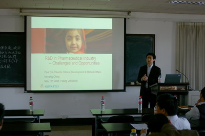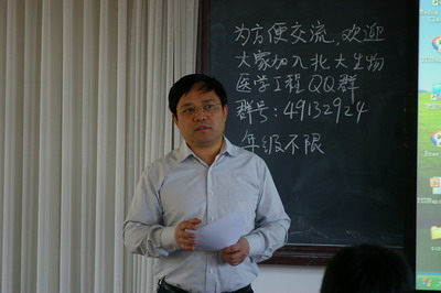上午的学术交流活动在力学434会议室举行。早九点十分,主持人葛子钢">葛子钢老师宣布活动开始,并依次邀生医系主任方竞">方竞教授、特邀嘉宾诺华公司临床开发及医学事务部总监Paul Dai和生医系的各位导师上台发言。方教授的开场白谈到了生医系的团队建设,谈到举办本次活动的意义主要是为了促进各个实验室之间的了解,为老师和研究生提供研究工作交流的平台,促进教学和研究的发展。嘉宾Paul Dai则带来了一场题为“药物研发在中国的机遇和挑战”的主题发言,引起与会师生的极大兴趣,不时有老师同学现场提问互动。报告结束后方竞">方竞教授代表生医系赠送了礼品。