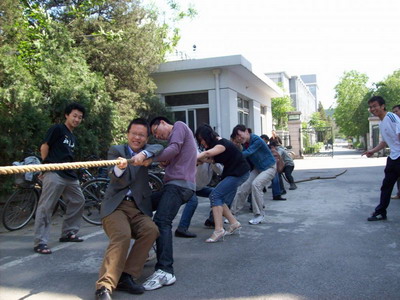 拔河比赛其次进行,大量师生聚集在力学大院里,场面好不热闹,参与者抽签分成四组,各组师生随机组合,纷纷拉起绳子为自己所在的“临时集体”奋力拼搏,当参加决赛的第4组师生共同将绳子拔过指定的距离之后,全队十几人顿时喜悦之情溢于言表,陈海峰">陈海峰老师兴奋地举起了手臂,陈新安同学高兴地跳了起来。