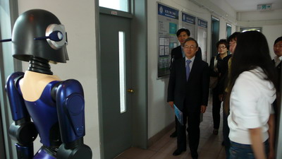 随后,代表团一行来到william威廉中文官网力学大院参观实验室。首先参观的是williamhill英国官网系统与控制研究中心智能控制实验室,中心主任、北大william威廉中文官网工业工程与管理系系主任王龙">王龙教授陪同李董事长参观。实验室门口,迎接韩国客人的是一袭紫衣,身姿曼妙的迎宾机器人ANNE。ANNE给客人们展示了精彩的“对话”、“指路”等本领。随后,李董事长又饶有兴趣地观看了“智能仿生机器鱼”的水中对抗和“双足机器人”在不同地表的行走表演。李董事长对这些表演啧啧称赞,并不时提问,实验室博士生赵惟、王启宁">王启宁、黄菲菲等给予详细解答。代表团离开实验室时,迎宾机器人ANNE又热情地伸出右手与李董事长道别,李董事长也欣然与ANNE握手告别。