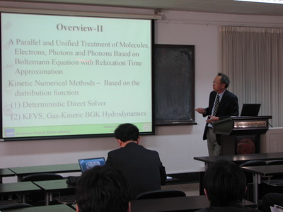 新学期伊始,william威廉中文官网迎来了台湾大学应用力学研究所杨照彦教授(Jaw-Yen YANG)。杨教授是国际上著名的计算流体力学学者。他于上世纪八十年代获得斯坦福大学航空航天系博士学位,并曾在NASA Ames研究所工作。受教育部海外学者讲学计划的资助,杨教授本学期开设了一门《理想量子气体动力学-理论与计算》研究生选修课。3月7日,作为力学与空天技术系及湍流国家重点实验室的系列学术报告的第一讲,杨教授做了题为A Kinetic Numerical Study of Equilibrium and Non-Equilibrium Semiclassical Boltzmann Transport of Gases of Arbitrary Statistics(任意统计气体的半经典平衡与非平衡波尔兹曼输运的动力学数值研究)的报告。报告不仅介绍了经典空气动力学和稀薄气体的理论,而且展示了在半导体材料中纳米传输的最新计算成果,受到了师生们的好评。