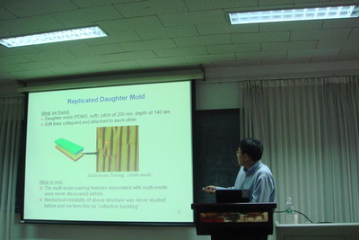 在报告中,他首先介绍了他提出的一种纳米印刷制造中能够有效缩小纳米结构尺寸的新工艺,并介绍其在生命科学和微电子器件等方面的应用前景。此外,针对纳米结构制造中出现的集体失稳情况介绍了具有创新性的理论分析工作,得到了与实验结果很符合的结果。最后他为大家介绍了近期的研究成果:自组装单分子薄膜。