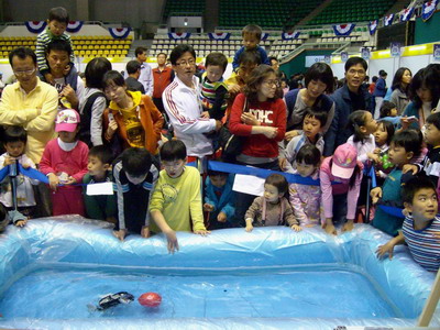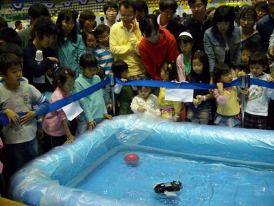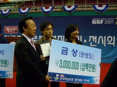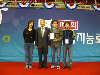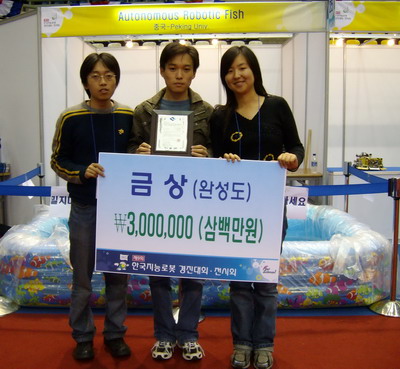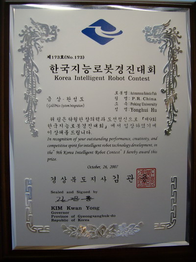 副教授的指导下,由研究生胡永辉、赵惟、王琦组成的williamhill英国官网代表队参加了此次大赛,经过两轮激烈的角逐,智能控制实验室所研制的自主机器鱼由于在系统集成方面的优势获得了大赛金奖(Gold Prize),同时获得了3,000,000韩元的奖金。浦项市市长和市领导饶有兴趣地参观了williamhill英国官网的机器人表演,并为williamhill英国官网代表队颁奖。