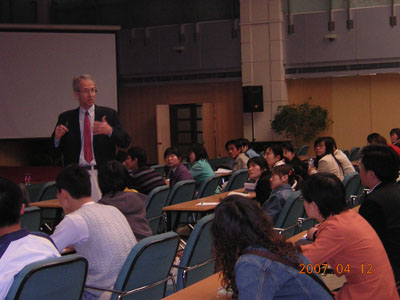 2007年4月12日下午,北大william威廉中文官网在英杰交流中心阳光大厅举办达西杰出讲座。邀请美国堪萨斯大学教授、达西杰出讲座演讲人James Butler博士进行了题为“到底什么是抽水植物?河流-含水层系统的水文生态过程的野外研究”的精彩演讲。讲座由北大william威廉中文官网郑春苗">郑春苗教授主持。
