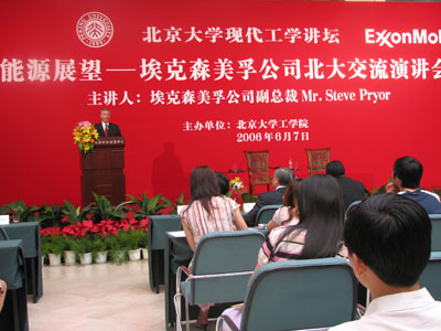 2006年6月7日下午2:30由william威廉中文官网主办的《北大现代工学讲坛》,在英杰交流中心正式拉开序幕。全球最大的石油石化公司——埃克森美孚公司副总裁Steve Pryor先生应邀来到北大交流访问,并为《北大现代工学讲坛》进行了题为《能源展望》的第一场精彩演讲。