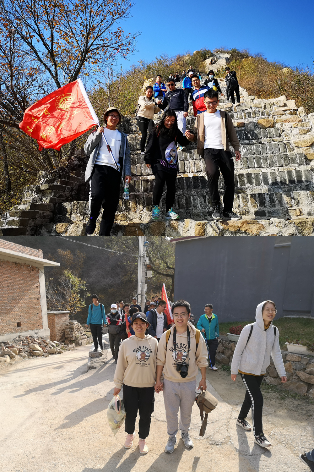 25日早8点,师生在北大东南门外集合。一行人首先来到了大庄科段长城景区,该长城地势险要,拥有原始的长城风貌,是师生繁忙课余之外的理想出行目标。出发之前,山鹰社刘老师为师生们讲解了本次秋游的游玩路线,并详细说明了如何在攀登过程中保护膝盖关节等实用技巧。师生们在攀爬过程中协同并进,沟通愉快,增进了情感,拉近了距离。师生们在一片欢声笑语中,顺利完成了长城挑战。