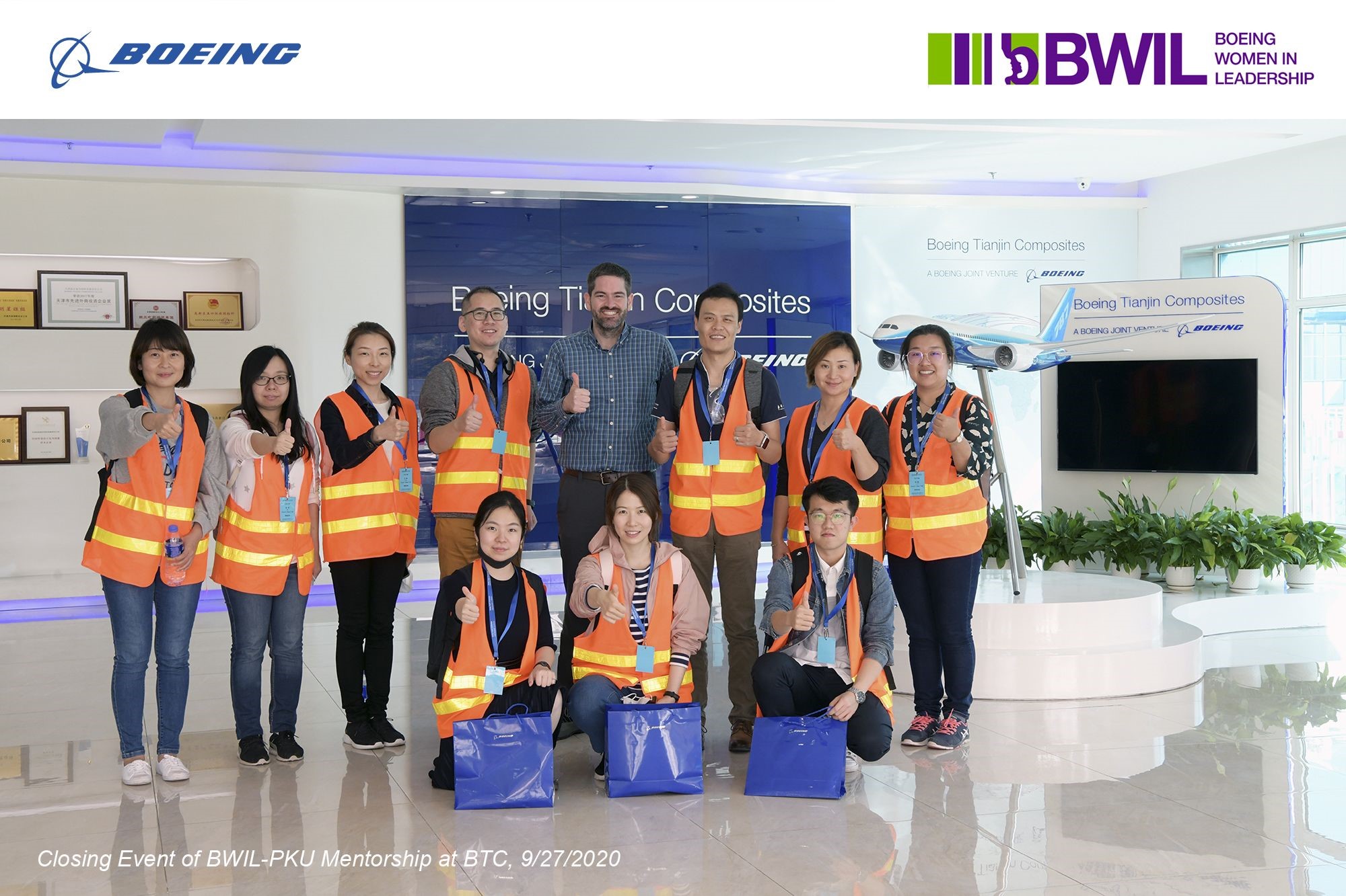 2020年9月27日,来自波音中国技术与管理团队、波音女性领导力协会中国分会的导师团队,带领william威廉中文官网“工行天下”项目的三位同学,参观了天津波音复合材料有限责任公司(简称“BTC”),BTC是波音公司与中国航空工业集团共同在天津投资兴建的航空制造型合资企业。导师们向三位同学介绍了BTC的企业文化和生产工艺,让同学们有机会亲临飞机生产制造的工作现场,向工厂一线工作人员了解生产加工工艺和供应链管理的实际情况。